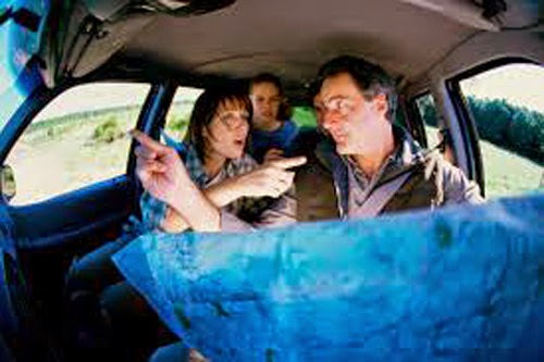 Él conduce y ella le orienta y le indica que gire en la siguiente calle a la izquierda, Él argumenta muy seguro que es hacia la derecha.